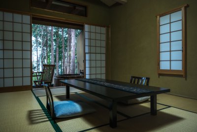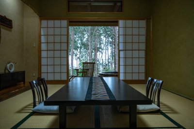 明るく落ち着きがあり、石と檜の円形の露天風呂を備えた客室です。