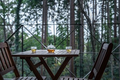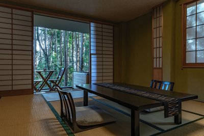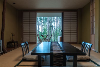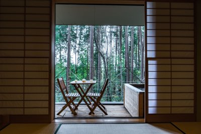 唯一1階にある、檜のお風呂を備えた、森が間近に感じられる客室です。